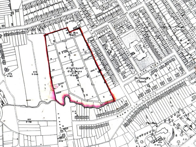 The allotments here have been in existence since the end of the 19th century. With increasing population growth and industrialisation in Derby this is when the tape factory on Dean Street and the surrounding streets of terraced houses were built. Prior to this the allotment land formed part of the estate belonging to The Firs, a regency villa built in 1826. The Firs and its estate belonged to Rev Canon Edward Abney (1811-1892) who was the vicar of St Alkmunds church and came from a family of landed gentry based at Measham Hall. Towards the end of his life Abney sold most of the estate to a company of speculators and developers, the Derby Land Building and Investment Company which had been formed in 1877. This same company still owns the allotment land today, together with much of the property in the area.