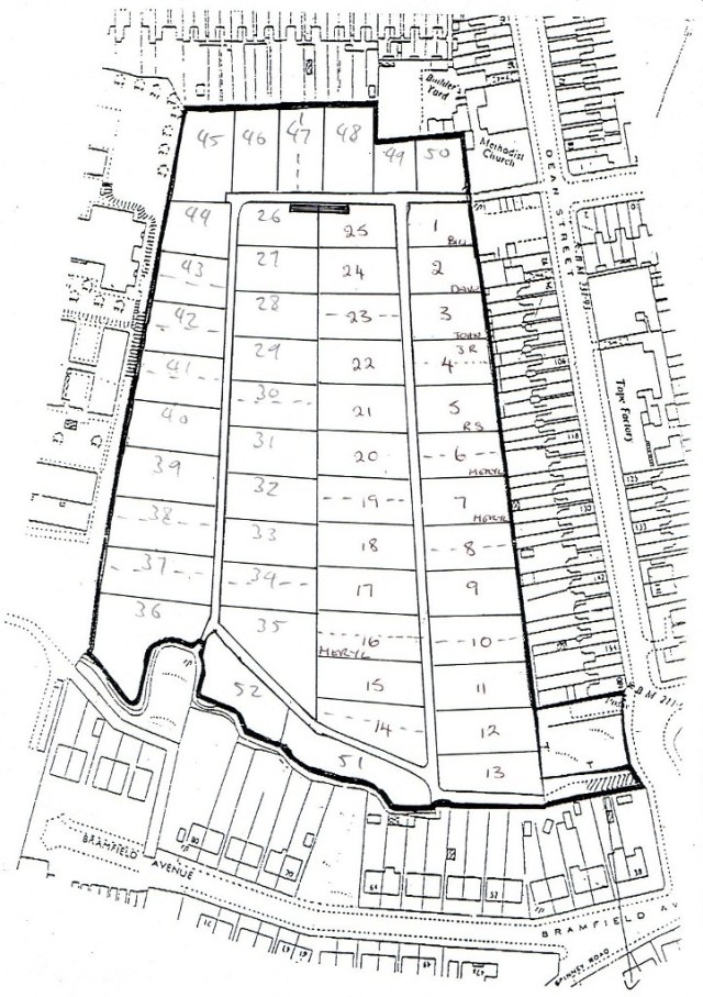 Most of this area has now been developed and the allotments lost, the only exceptions being our site and the area marked “Blue” at the lower right of the map which is now Bramfield Avenue Allotments belonging to the city council.
